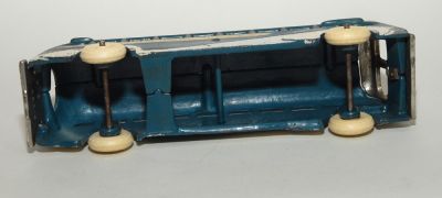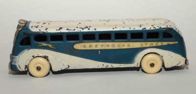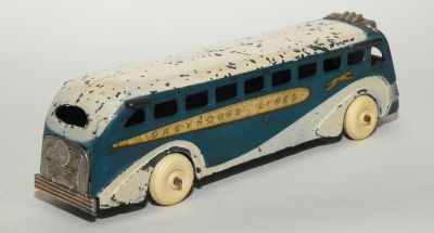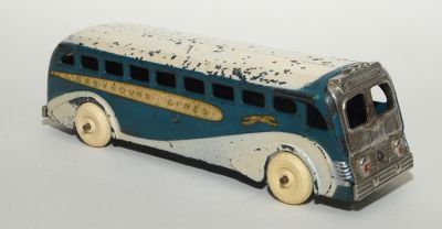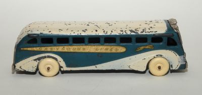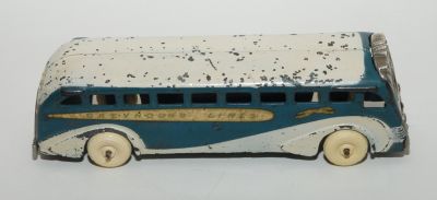Really nice example of the Arcarde Greyhound bus from this period. Has high quality rubber replacement Arcade tires, but otherwise all original. Play wear, yes, but most of the nicks are on the roof. Nickled front and back are excellent. Perfect casting all around, no cracks or breaks. Decals a bit faded and discolored with age, as appropriate.