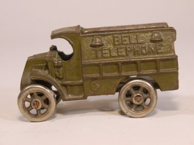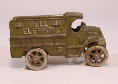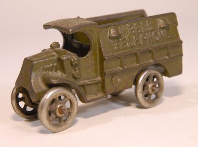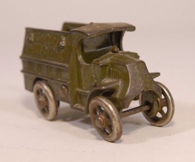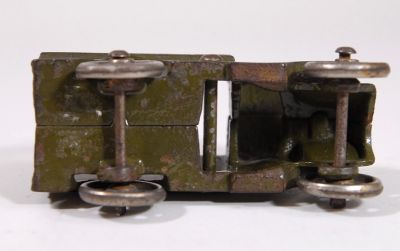 This little guy is more often seen with rubber tires, but these are the NICKEL wheels. No cracks, rust, or repairs. Has some paint loss, mostly on the top, but paint is still more than 80% Actual size is 3.75 inches. Call it a C7, and a bit rare.