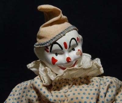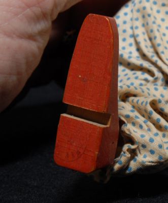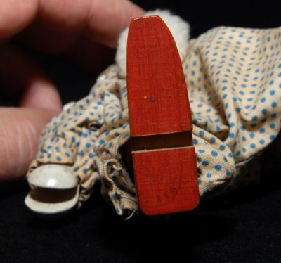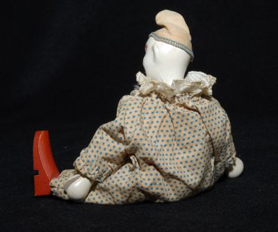 Here's a Shoenhut clown looking for his circus! Bright face, but has a small piece out of his left cheek bone. Otherwise, very nice condition. Costume is a bit soiled. You can still make a part of the stamp on the bottom of his right foot that says "Humpty"