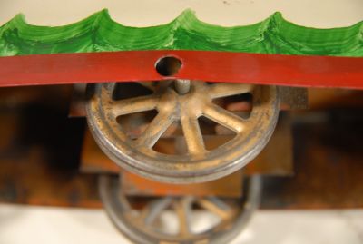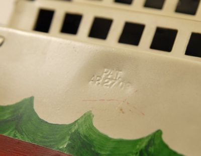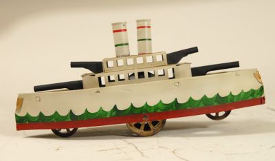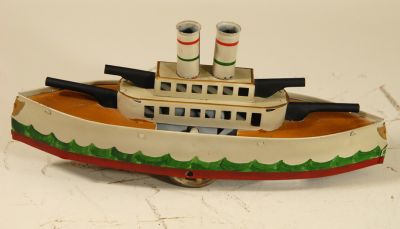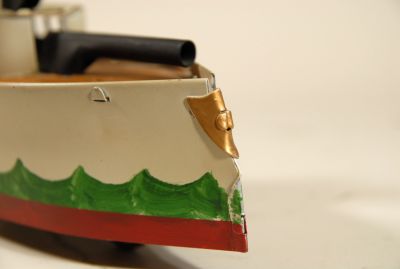 I think this an older restoration job on this Schiebel "flywheel drive" battleship. Nicely detailed paint job, though. Showing some stains in a few places and it does have a few scratches, but NO RUST, no dents, and overal in great shape for a toy of this age. Has a patent date stamped into the side, "PAT AP 27 09"