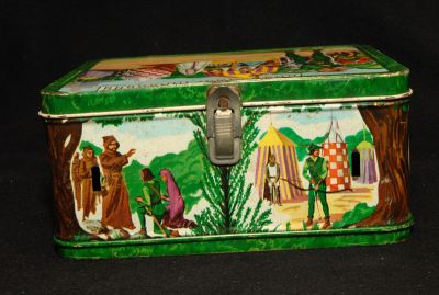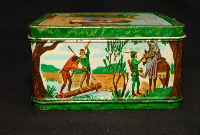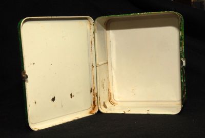 This lunch box has a few issues, like the missing handle...but in pretty good shape for a box that's over 50 years old! Has some surface blemishes, light rust in spots, rubbing, etc. See for yourself in the pictures. If I could find the handle, it would be priced closer to $75.00. Find your own handle and save!