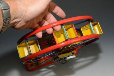 Chein USA made this ferris wheel in 2 versions, one with the Mickey Mouse theme and one without. The Mickey Mouse versions were probably sold at Disneyland as a private label variation. This one doesn't have a box, but otherwise EXCELLENT. Works fine, bright and shiny litho, no missing parts that I can tell. One bucket/seat has some bends and creases, but that's the only flaw I see beyond the usual scuffs and nicks consistent with a toy this old...and obviously loved and well cared for by a kid in the 1950s.