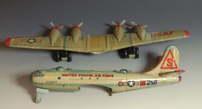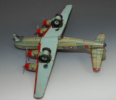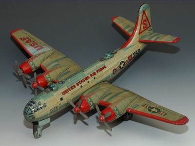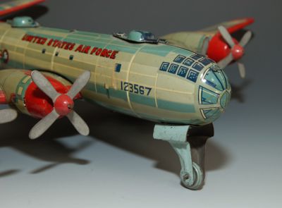 This Japanese friction airplane is fairly had to find in good condition, and this one is pretty nice. Not perfect, but if it were it would be priced well over $1,000. No rust, litho is pretty good throughout, no major missing parts.