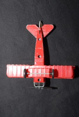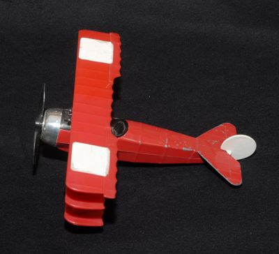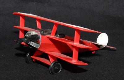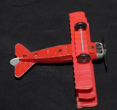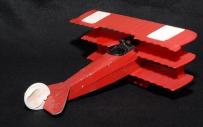 This is the Red Baron Tri-plane by Tootsietoy, probably from the 1950s or 60s. Good condition except for the decals, which have been bleached out. Top wing has slight bend on the end of one side, perhaps from sitting in the sun too long. Body is aluminum, everything else plastic. 9" wingspan, and about 9" long.