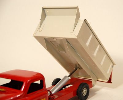 The Hydraulic Cylinder lifts the bed nice and slowly as it should. Usually these are worn out, and spring back way too strong. Not this one. Interesting to note, too, that the rear bucket is MANUALLY raised (kid powered), and not raised with a lever like the earlier Structos were.