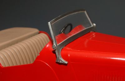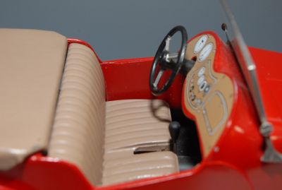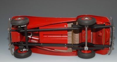 Produced from 1954 to 1956, this version has the metal wheel covers, indicating an earlier model. It is also the pre-painted red finish. Many were released only in primer, and the kid had to paint the car himself.