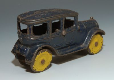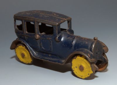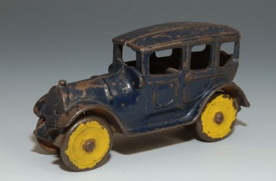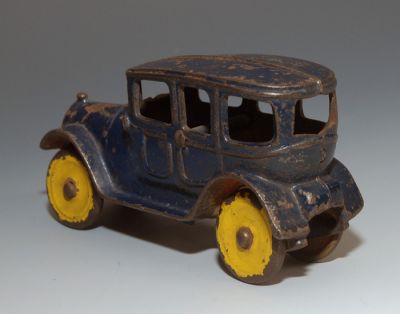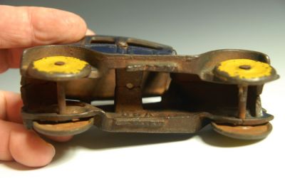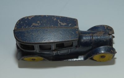 My guess is that this is a Dent, but it could be Hubley. Touring car is from the 1920s, no breaks, cracks or repairs. Some paint loss as seen in the pictures. Only marking on the car is the USA underneath. Measures about 5.25 inches. Nice little car.