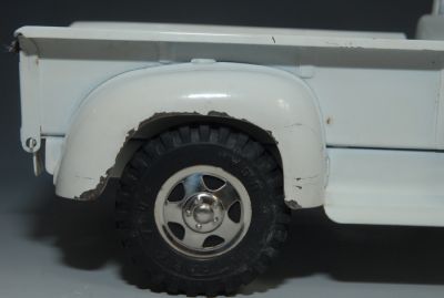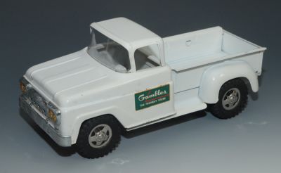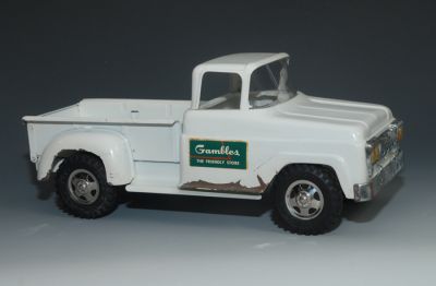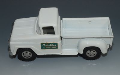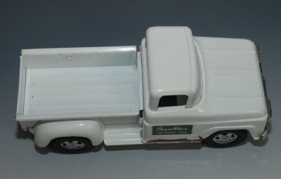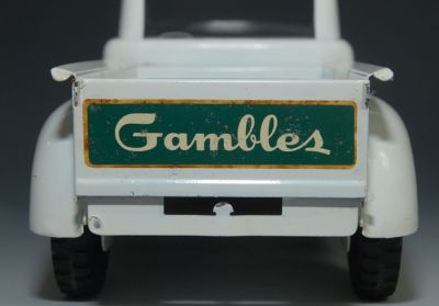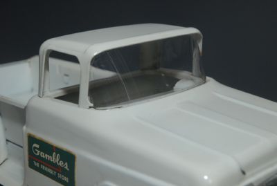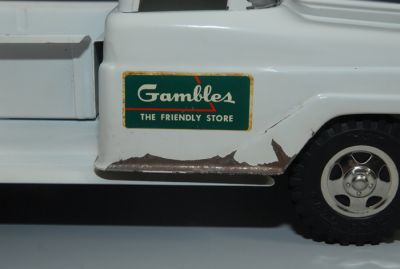This is a really nice Gambles pickup truck, with one exception....it looks like the passenger side was in an accident, resulting in paint loss on the bottom of the door and nicks and paint loss around the wheel well.