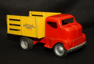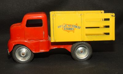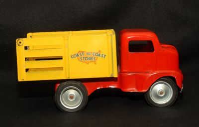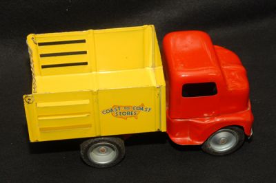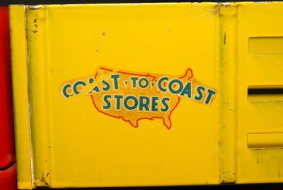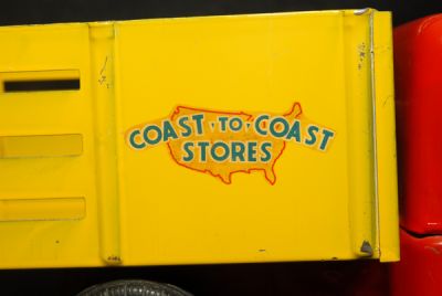 This is a VERY NICE example of the Tonka Coast To Coast Stores utility truck. All original, even the chain, it appears. Has some light play wear and scratches as expected for a played-with toy. Decals are good....one is perfect, the other has a scratch through the middle. Solid Toy. NO RUST.
