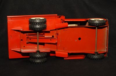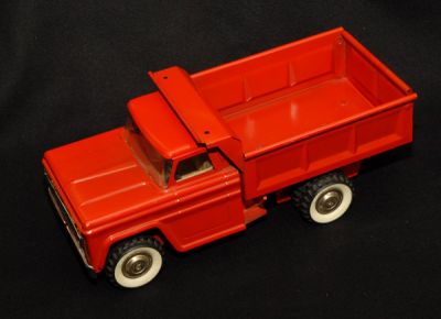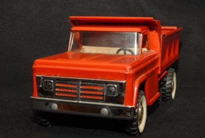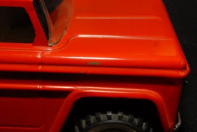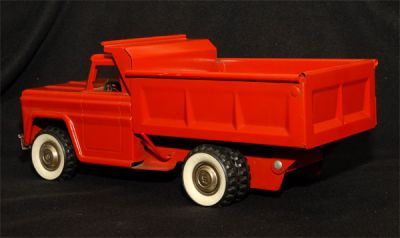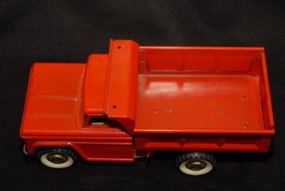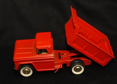 Almost Perfect! This Structo dump truck looks like it was never played with. Has a few light surface blemishes from age, and some light rubbing on the windshield, but paint is nearly perfect, chrome is bright and shiny, tires and wheels are like new. From the 1960s.