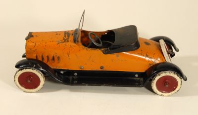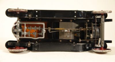 According to the Structo ads about this car it has a "Heavy triple spring motor, cut steel gears, disc wheels, rounded fenders, plate glass windshield, extra wheel -- all the features of a high class car....Two speeds forward and one reverse."