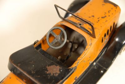 The windshield frame on this one is a replacement (no glass), and 2 of the gears are missing a few teeth (see photos). Shifting levers work fine, steering is fine. The winding key is also missing, so I don't know about the clockwork mechanism, but there is no visible damage. Often you see this car in pieces, or missing wheels, or no mechanics at all. This one will look great on the mantle, and I don't really care if I sell it...so it is priced accordingly.