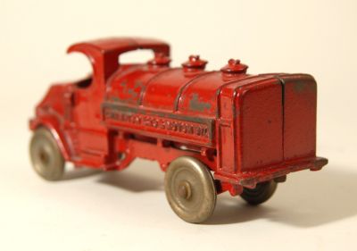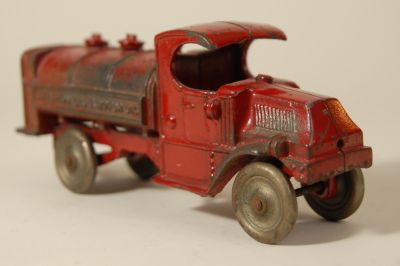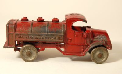 Nice C-Mack "Champion Gas & Motor Oil" truck. No cracks or breaks. Does have some paint loss, mostly on one side. But doesn't look like rust, possibly from heat. Disc wheels. All original. 8 inches long.