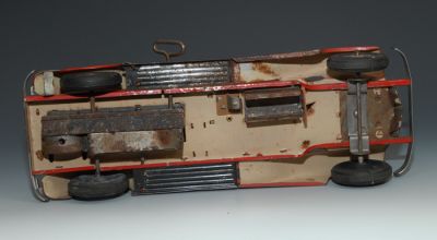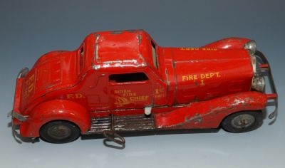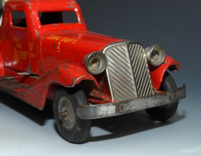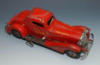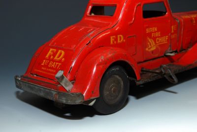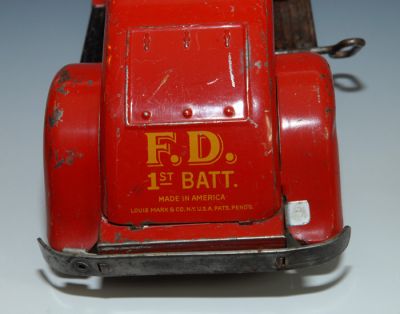1930s "1st Batt Fire Dept." car by Marx. Pressed Steel windup, with siren and electric lights. The windup works, but it's kind of weak and I didn't want to wind it too tightly. When it runs slowly, the siren sounds more like an engine growl, but it does work. I'm not sure about the electric lights, since I did not have the proper bulbs to test them, but the battery compartment is clean so I'm guessing they could be made to work. If I buy the new bulbs (available online for about 12 bucks each), I will add that to the cost of the car. But for now, being offered without bulbs and no guarantee that they'll light up.