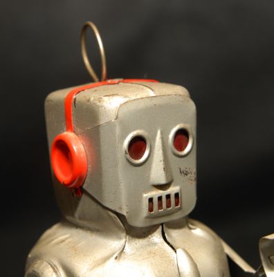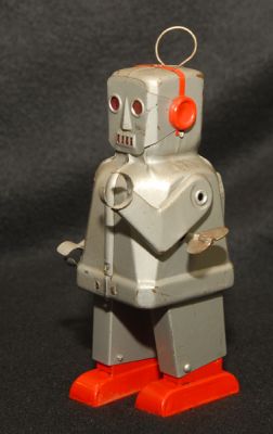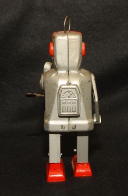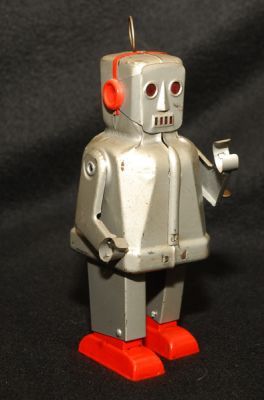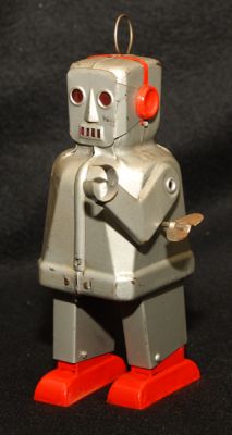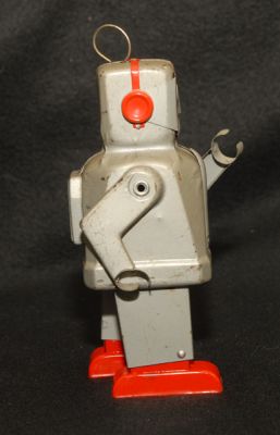 Really neat little robot from 1954. Sparky walks very well when wound, but sparkling effect in eyes no longer works. He's also missing a spring-like attachment that should be on his antenna. It doesn't appear to have any function, as far as I can tell....and it should be replaceable.